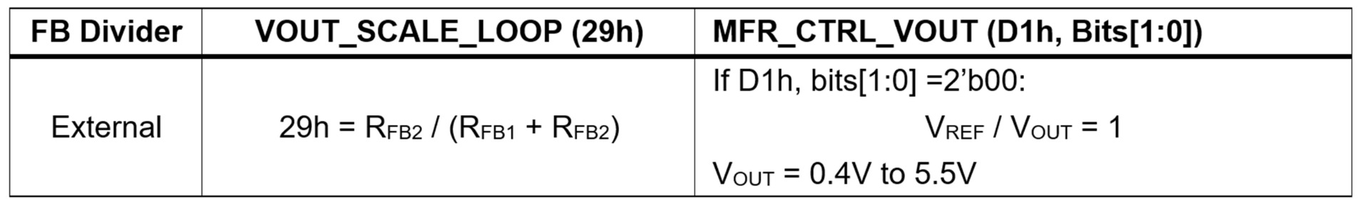 表 3 显示了使用内部电阻分压器时,通过设置VOUT_SCALE_LOOP(29h)和 MFR_CTRL_VOUT(D1h)得到的 VOUT 范围。使用内部电阻分压器时,必须完全断开外部反馈(FB)电阻,并根据实际应用选择合适的电压范围。