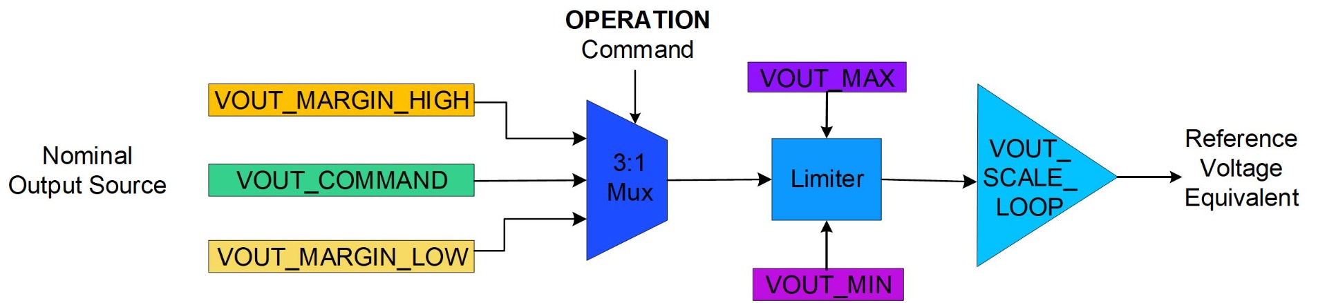 以 MPM3695-10 为例,VOUT 命令流程包括使用 OPERATION 命令选择三个输入之一作为标称电压的来源(VOUT_COMMAND、VOUT_MARGIN_HIGH 或 VOUT_MARGIN_LOW)(见图 3)。