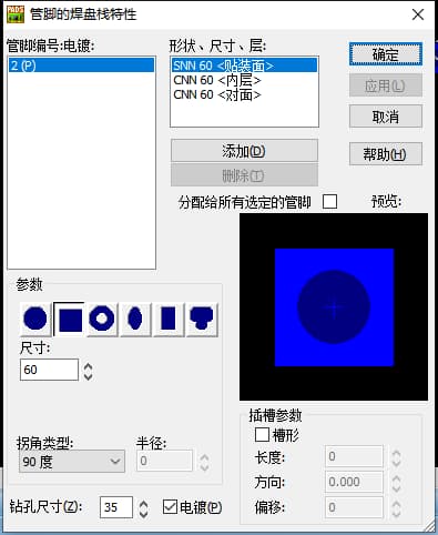进入之后的界面如下图所示,它可以更改焊盘的形状,长度宽度,层级(内层外层贴装面选择)厚度等等。