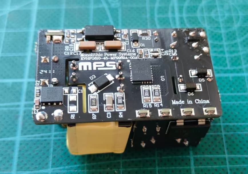 本次测试的开发板为VHFG610-45-MP9989A-00A评估板,主要用于演示HFG610-45和MP9989A的功能。该板尺寸小巧,功率密度高,其电气规格非常适合手机和电脑电源适配器。该板具备超低空载功耗(<30mW),整体效率高,符合美国能源部 (DOE) VI级和欧盟委员会 (CoC) Tier2标准。本开发板是典型的离线反激+GaN+QR+USB-C PD设计方案。输入电压支持90Vac-264Vac,频率支持47Hz to 63Hz.