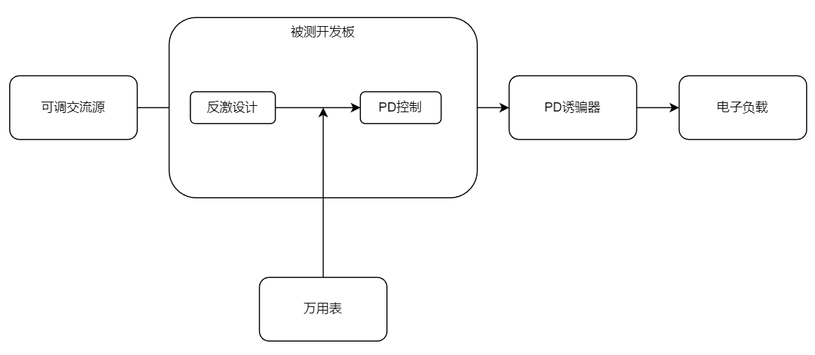 可调交流电源以及PD诱骗器以及电子负载实际上都可以继续电压电流的显示,万用表用于中间状态(电压)的测试。
