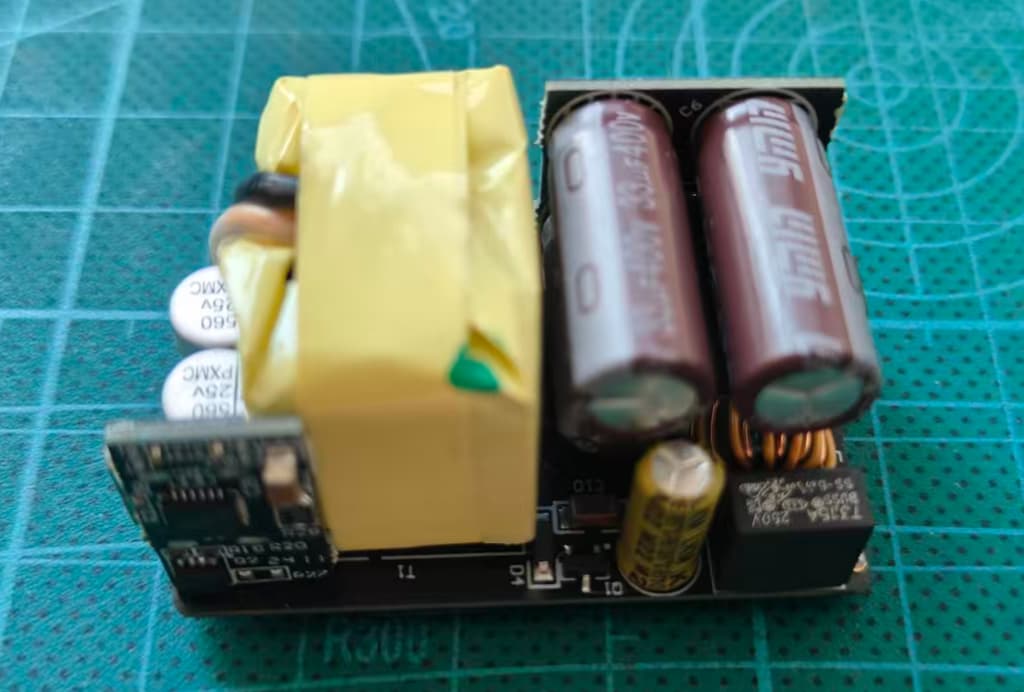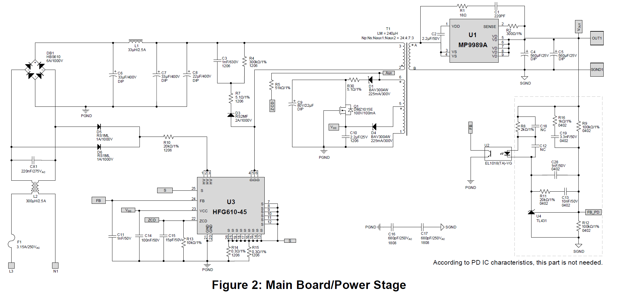 上图是这款开发板AC-DC部分的原理图,可以看到其反激控制使用的是HFG610-45,作为一款高集成度的准谐振(QR)反激式控制器,与GaN HEMT共封装,这种设计极大地提升了电路的性能和高频工作能力。与传统QR反激式稳压器相比,HFG610-45通过频率折返功能确保了全负载范围内的高效率。注意HFG610-45是基于副边稳压 (SSR) 的原边稳压器,需要搭配副边反馈电路工作。高频设计允许使用更小的无源元件,如电感和电容,从而实现了更高的功率密度和更紧凑的电路设计。高集成度减少了外部元件数量,简化了电路设计,同时提高了系统的可靠性和效率。高频设计进一步提升了功率密度,使得开发板尺寸小巧,非常适合手机和电脑电源适配器等空间受限的应用场景,例如本次的PD适配器。