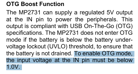 MP2731,使用OTG功能会导致,系统电源VSYS保护,没有任何输出,电池必须断掉才能重新有VSYS电源。