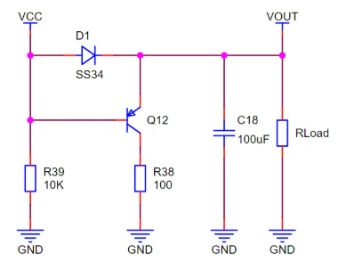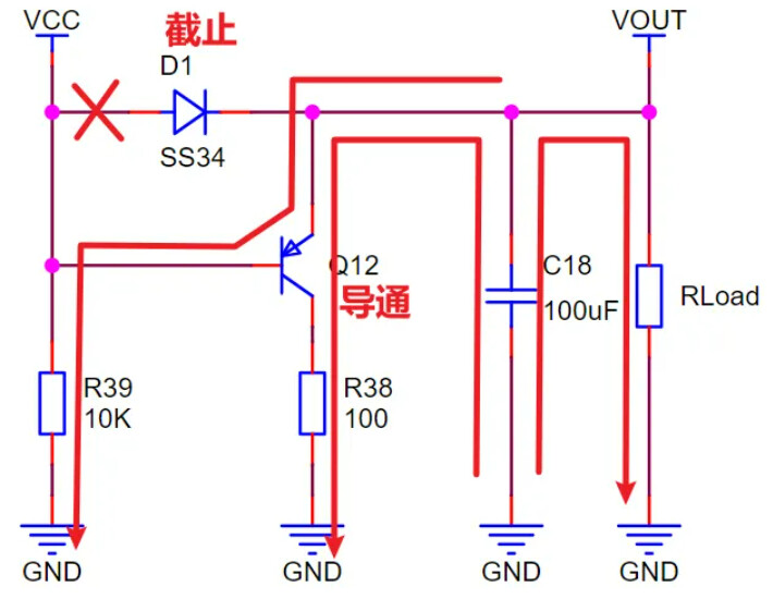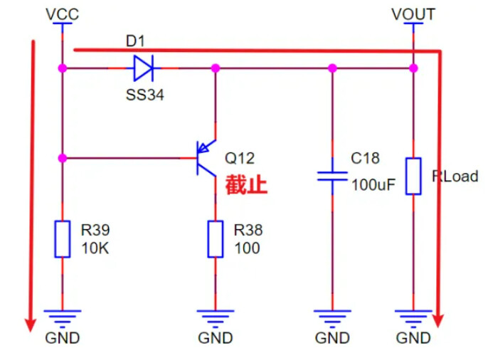 VCC供电时,二极管D1导通,三极管Q12截止,VCC通过二极管D1为负载供电,电流路径主要为下图红色所示,从电流路径也可以看出,这个电路的缺点就是在正常工作时电阻R39和二极管D1会额外的消耗能量: