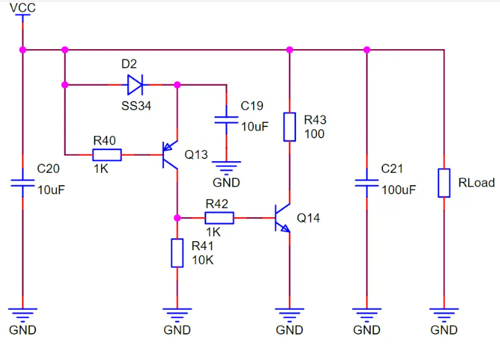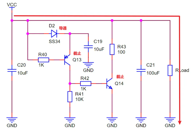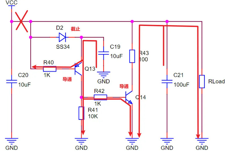 当VCC断电时,二极管D2截止,由于电容C19上存储有电,所以当负载电容上的电压下降到大概为VCC-Vd-Vbe左右时,三极管Q13会导通,从而控制三极管Q14导通,**负载电容C21上的电通过三极管Q14和电阻R43快速释放。**电流路径如下所示: