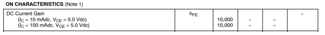 那么我们再看一个达林顿管的电流放大倍数,就拿刚才的压力变送器上使用的MPSA28的达林顿管来说,其电流增益可以轻轻松松到1W倍,这也是两级三极管带来的好处,因为达林顿管的增益计算为β*β,两个三极管的直流增益乘积: