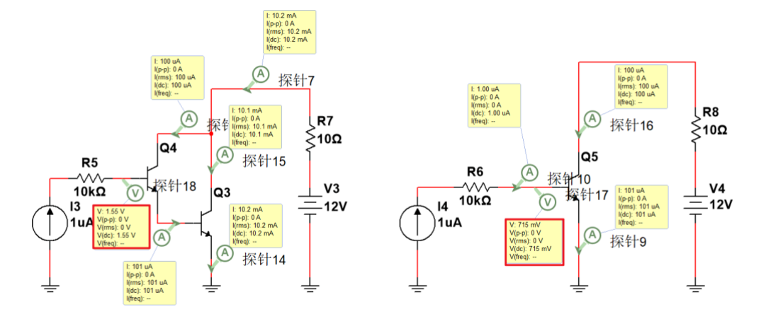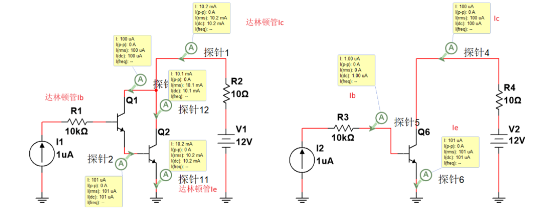 接下来是达林顿管放大区的电流增益仿真与普通三极管的对比,图中所示所有的三极管均为理想三极管,增益统一设置为100倍。可以看到,达林顿管的高电流增益的优势就很明显,在提供1uA的基极电流下,放大倍数β约等于100*100就是10k倍。而普通的三极管增益则是100倍。这也是达林顿管小电流控制大电流的魅力所在。