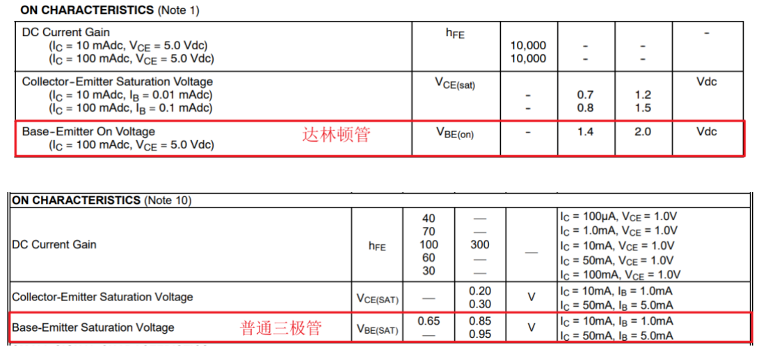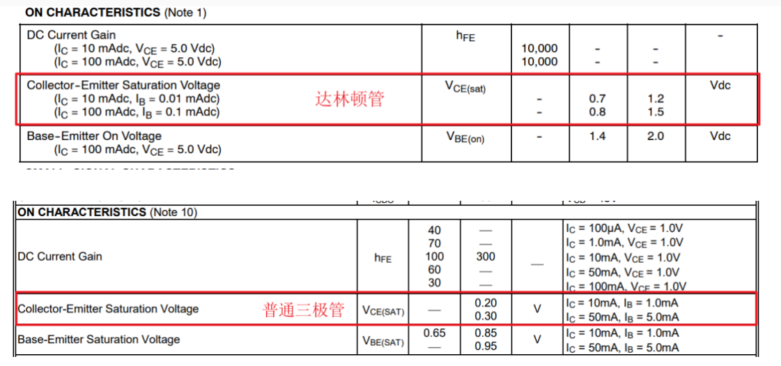 除此之外,第二个缺点也很明显,就是饱和压降很大,常规三极管深度饱和之后,饱和压降可以低至0.1~0.2V左右,然而达林顿管的饱和压降则大概为1V左右,这也是由于其独特的双管结构导致的。达林顿管的Vce等于第一个三极管的Vbe加上第二个三极管的Vce;下图是MMBT3904(普通三极管)和MPASA28(达林顿)的规格书Vce饱和压降参数对比: