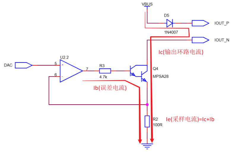 那么如果使用的是普通的三极管呢?假如放大倍数β是100倍,那么由于三极管处于放大区,那么在4mA的时候,误差店里Ib为40uA,那么此时实际环路电流Ic为3.96mA。可以看到在下图这种4~20mA的电路拓扑上,是首选达林顿管或者MOS管的。