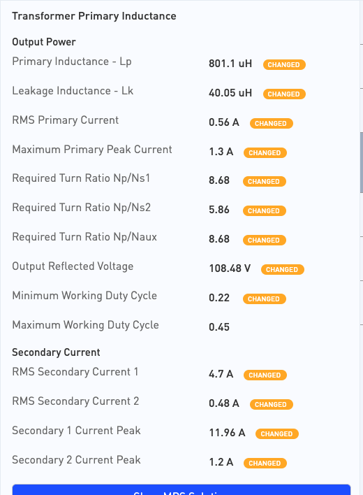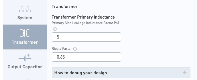 Transformer模块设定漏感系数5%、纹波因数0.65,工具自动计算变压器参数:
