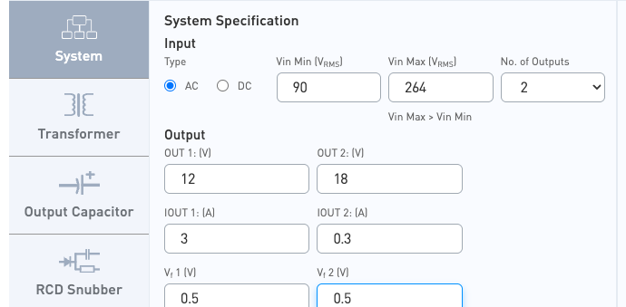 在System模块配置基本参数:AC输入90~264V,双路输出12V/3A + 18V/0.3A,开关频率70kHz,效率预估92%。