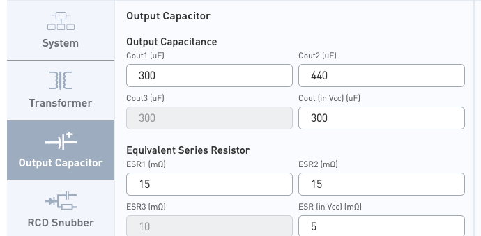工具默认给出电容配置:OUT1 300μF/ESR 15mΩ,OUT2 440μF/ESR 15mΩ。