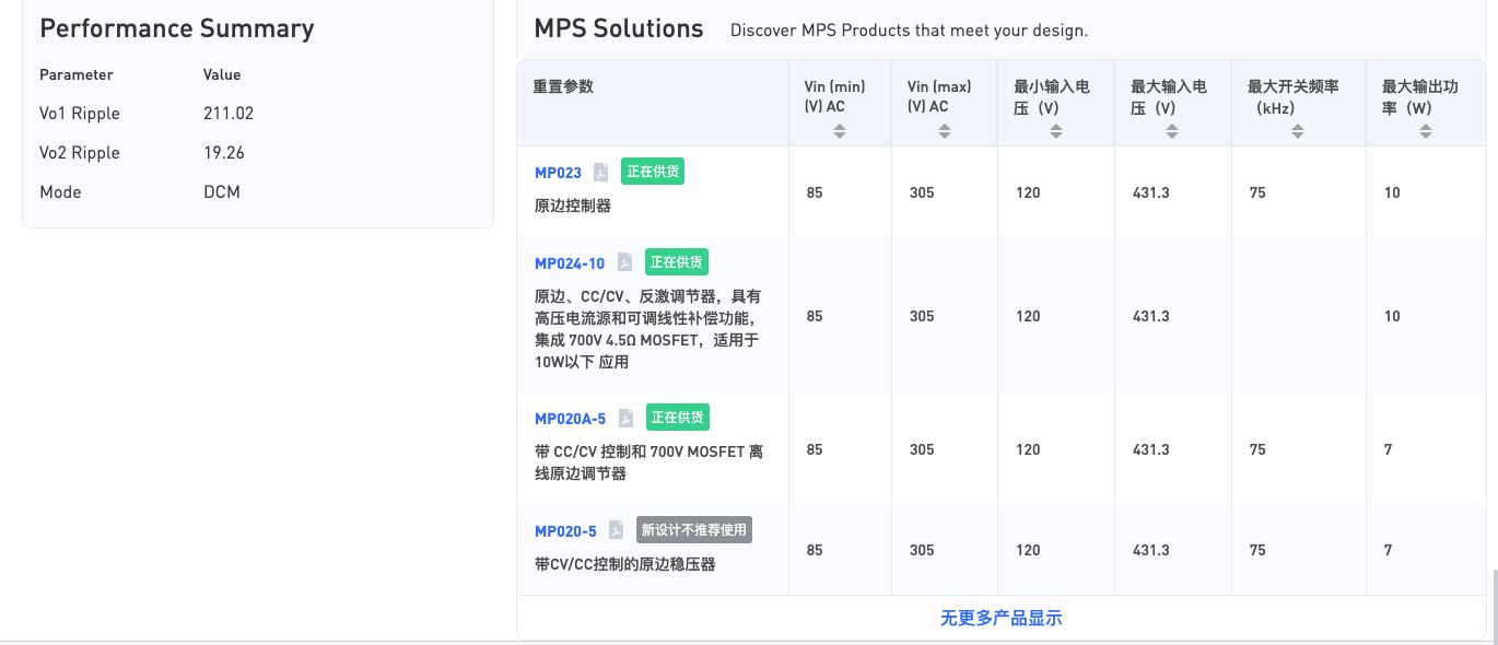 点击 “Show MPS Solution”,工具显示工作在DCM模式,并推荐以下MPS产品: