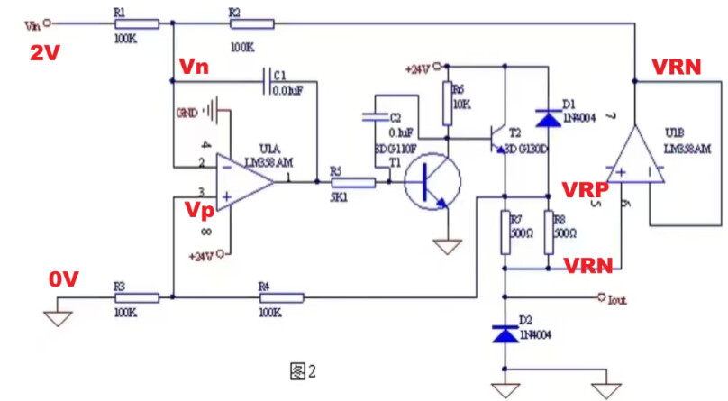 那么对比也可以看出,这个面试题和这个Howland电流源就是一个拓扑,只不过增加了一个三极管做了额外的转换。那么如何分析呢?我们可以按照如下思路去解析,很快而且很简单。我们先规定一下几点的电位名字,输入电压为2V,电压跟随器U1B的输出跟随同相输入端电压,都叫VRN: