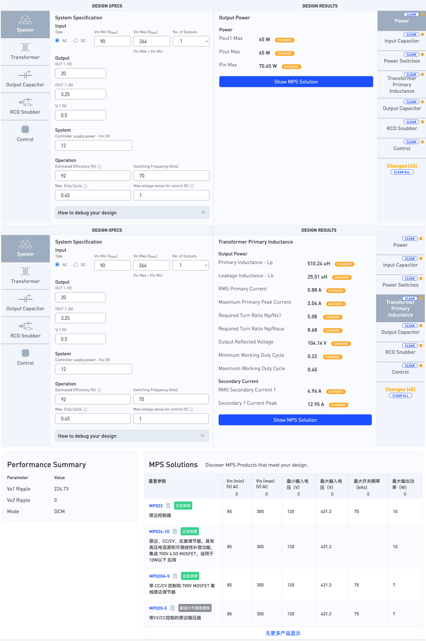 点击 “Show MPS Solution”,工具显示工作在DCM模式,输出纹波Vo1 Ripple = 224.73mV,并推荐以下MPS产品:
