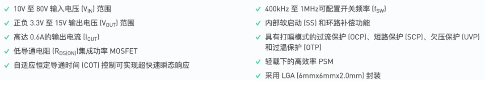 根据首页描述,它支持 10V 到 80V 输入 、最高 0.6A 输出 ,输出可以做成 ±3.3V 到 ±15V ,并且采用 COT(constant-on-time,恒定导通时间)控制 。