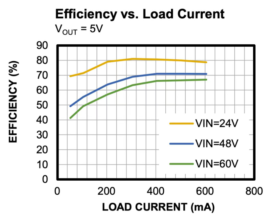 首页有一个 Efficiency vs. Load Current 曲线,条件是 VOUT = 5V ,输入分别是 24V、48V、60V 。