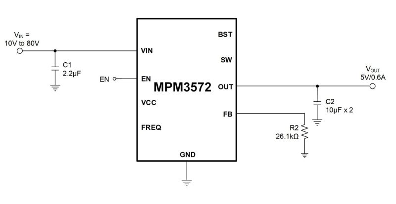 这是它最亮眼的地方。很多常见 Buck 只有 36V、40V、60V 输入上限,而这颗能到 80V ;这意味着它可以直接挂在很多工业总线上,例如:12V/24V 工业系统,48V 通信/工业母线,有一定浪涌余量的高压直流母线。