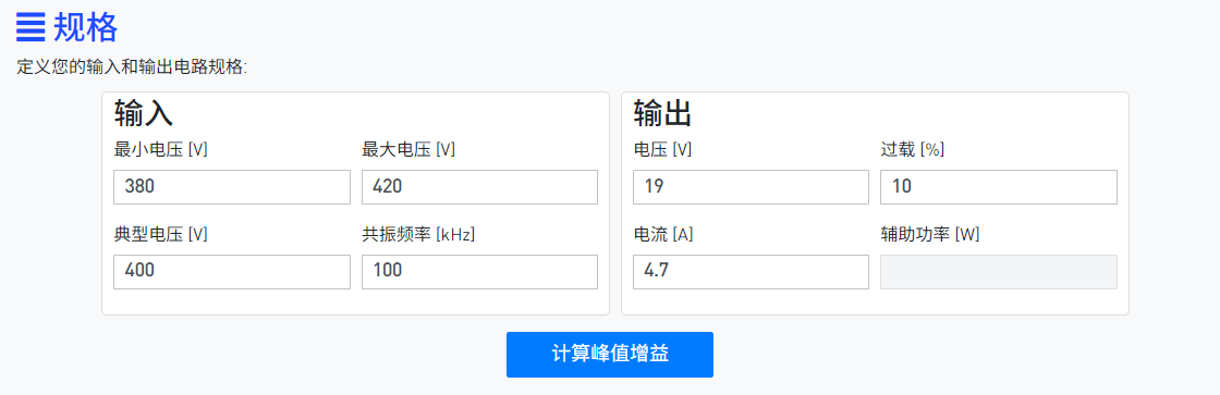 设计目标为 380~420Vdc 输入、19V/4.7A 输出,输出功率约 89.3W。这个场景比较典型,一方面参数容易理解,另一方面也比较适合观察工具在常见适配器输出条件下,对变压器匝比、谐振腔参数以及工作频率范围的处理是否合理。