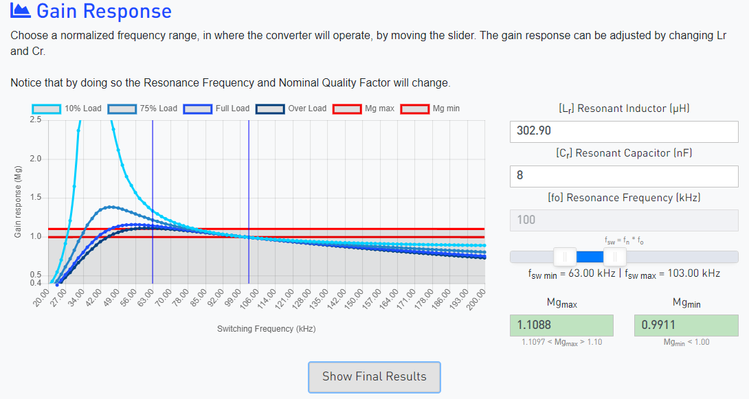 完成 Ln 和 Q 选择后,进入 Gain Response 步骤。这里对工作频率范围进行了调整,最终选定的窗口为: