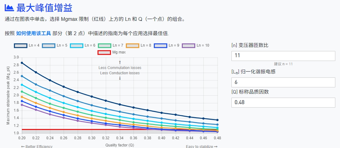 首先进行峰值增益计算。工具给出的建议匝比为 n = 11,同时得到: