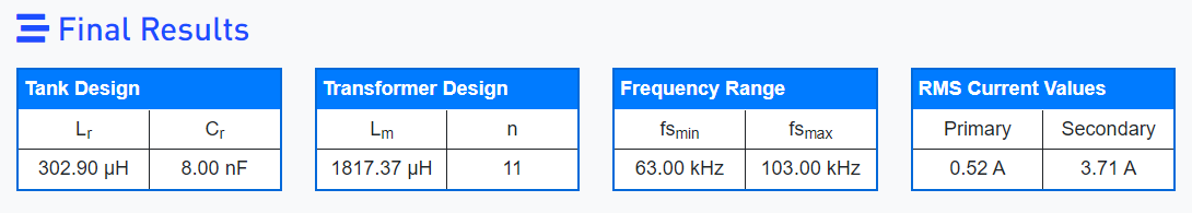 Lr、Cr、Lm以及 RMS 电流结果来看,这组参数至少表现得像一套具备工程参考意义的 LLC 初始设计结果