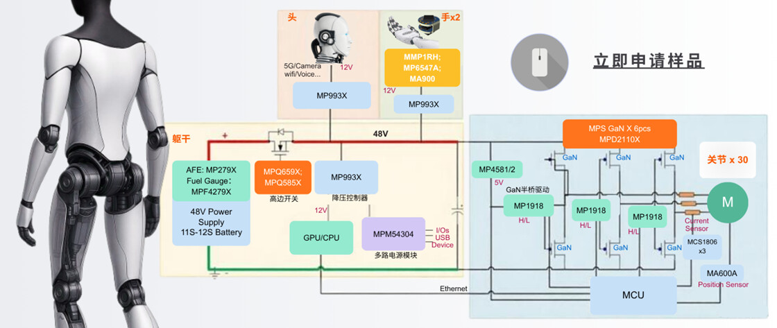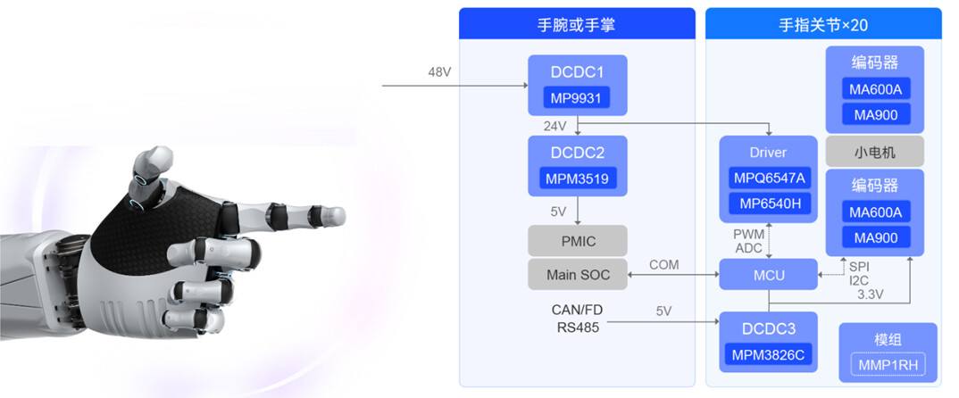 以 MP6540H 三相集成驱动芯片为核心,内置功率桥与电流采样,外围简洁,支持精准电机控制,驱动多关节手臂与灵巧手平稳运动,适合人机交互场景。