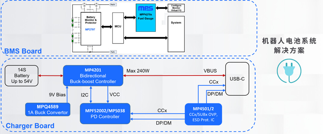 在线不停机换电的关键技术是电池热插拔控制技术,高/低电压电池防反充控制;在拔插过程中在高低电压电池切换至电压母线的时候通过MCU检测机器人母线电压同时通过I2C配置MP4201的同步双向升降压控制电路使得切换电压尽可能接近现有系统的电压,防止高压差带来的倒灌电流,然后输出电压升至高电压电池一至的电压再通过MOS切换,并关闭MP4201.
