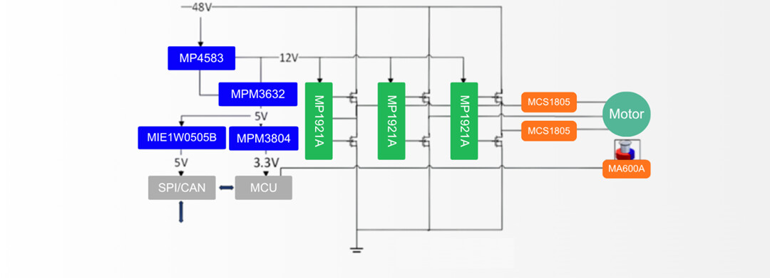 方案上,MP6540H 用来做三相电机驱动,MA600A 用来做角度检测反馈,MCS1805 用来做电流检测,MP4583 负责系统供电。整体实现电机驱动、位置反馈、电流监测和电源管理等功能,构成一个完整的关节驱动小模块。