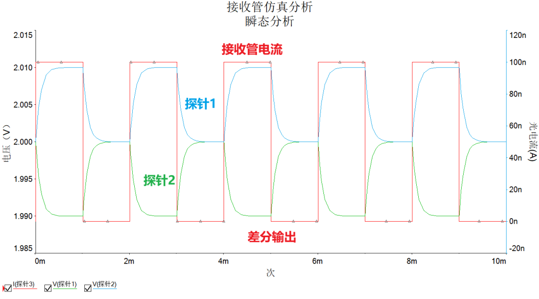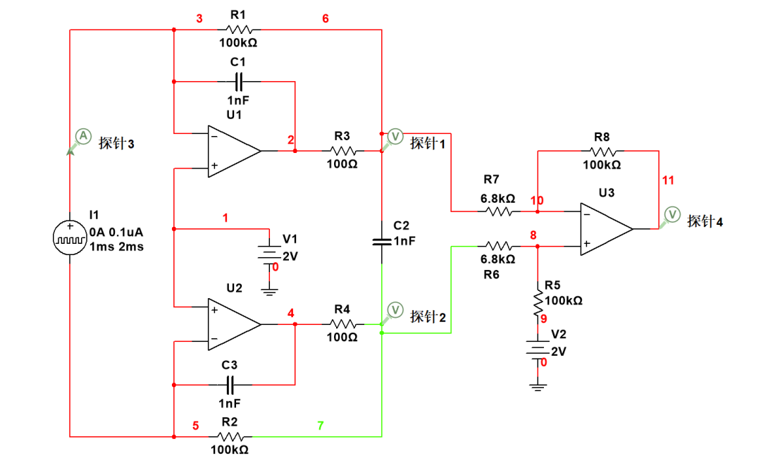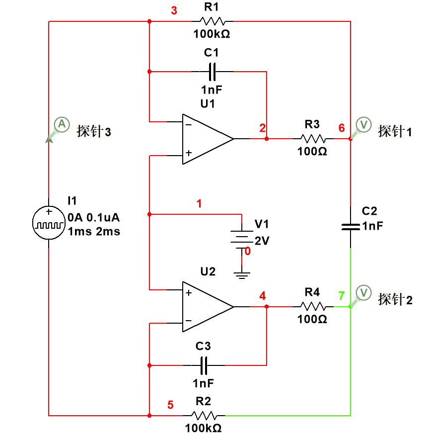 那么下面我们就分析这个差分跨阻放大器(名字我取的,我也不知道叫什么名字好)。通过仿真我们可以看到,可以简化成如下所示的仿真,由于红光LED和红外光LED是交替发光,所以可以等效为一个脉冲电流源(电流值会随血液中血氧浓度等参数发生变化)。我们为了更简化,就直接使用一个周期为2mS,脉冲为0.1uA的电流源简化代替接收管。搭建仿真如下所示: