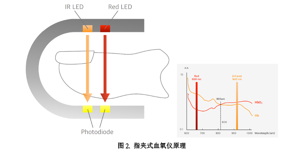 血氧仪中的LED发射管分别用红外光和红光透射手指,用光敏晶体管接收透射光。因为血管中的氧合血红蛋白和脱氧血红蛋白对这两种光吸收率不同,并且透射光的光强与吸收物质的浓度呈负相关,所以可以通过透射光的光强计算出血管中氧合血红蛋白和脱氧血红蛋白之间的比例,从而得到血氧饱和度。