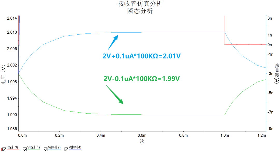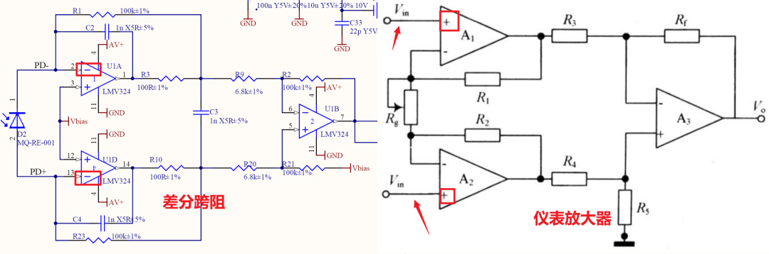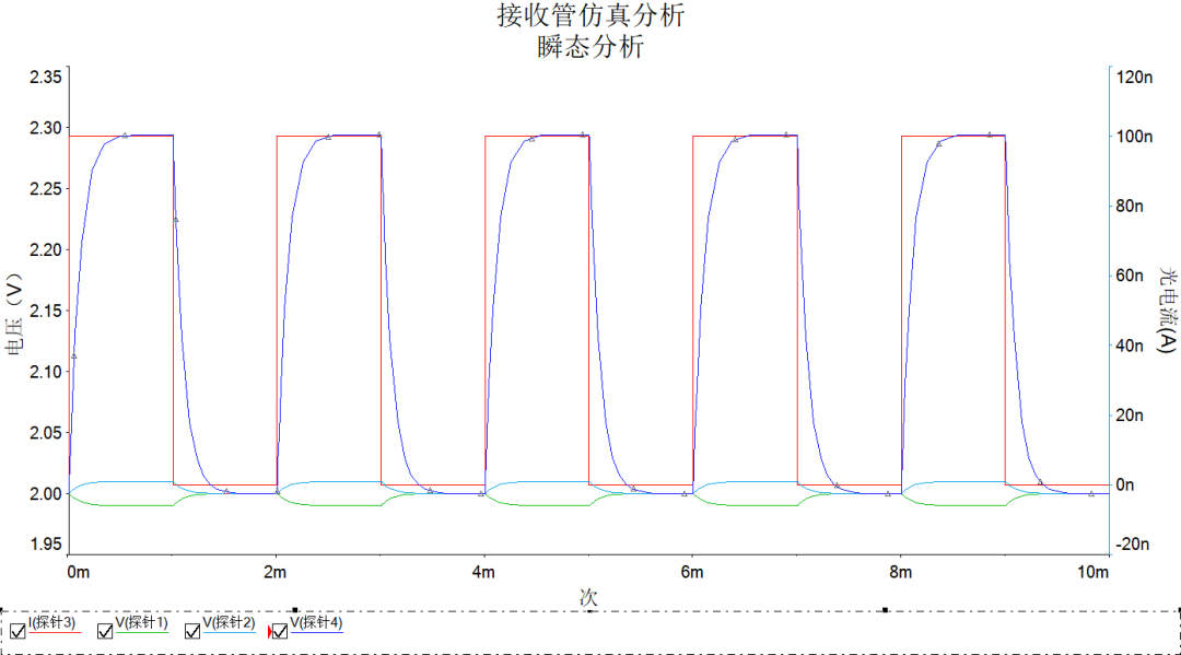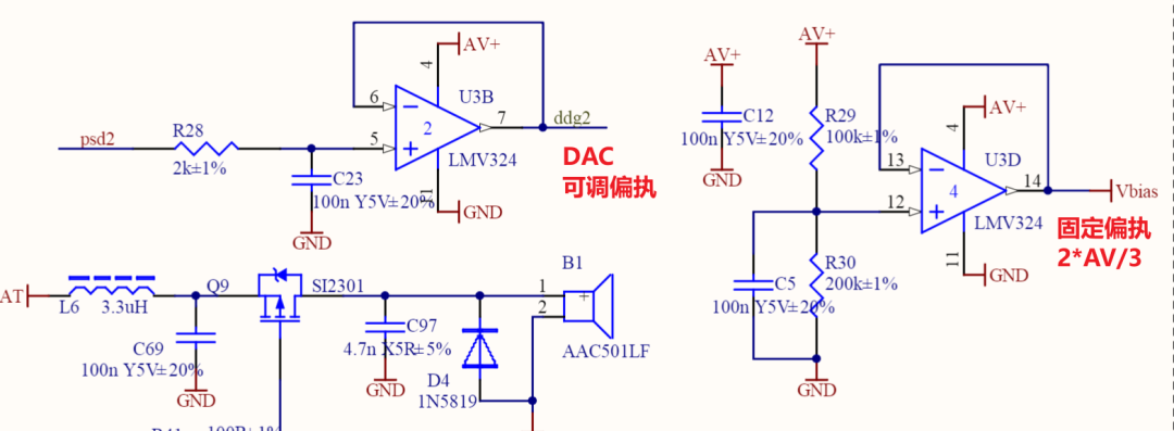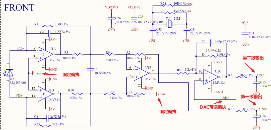 然后是接收管这边,搭建了一个差分的跨阻放大器,然后再用一级差分比例放大电路转为单端输出(RC滤波后输出给AIN0+)。然后再经过一级反向比例放大电路(放大倍数为14.7倍)输出(RC滤波后输出给AIN2)。其中差分比例放大包含偏执电压Vbias。第二级反向比例放大包含偏执电压ddg2*11-Vbias*10。