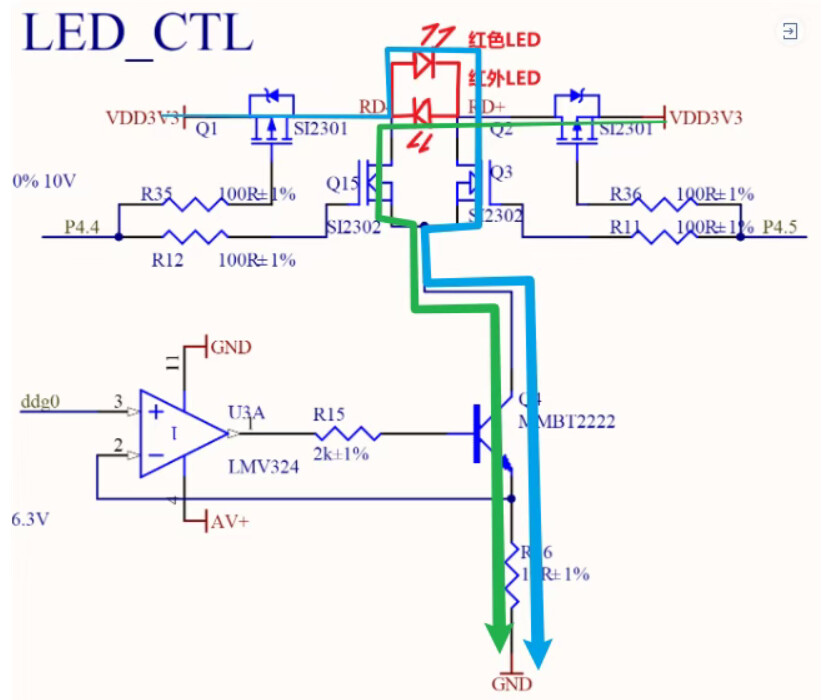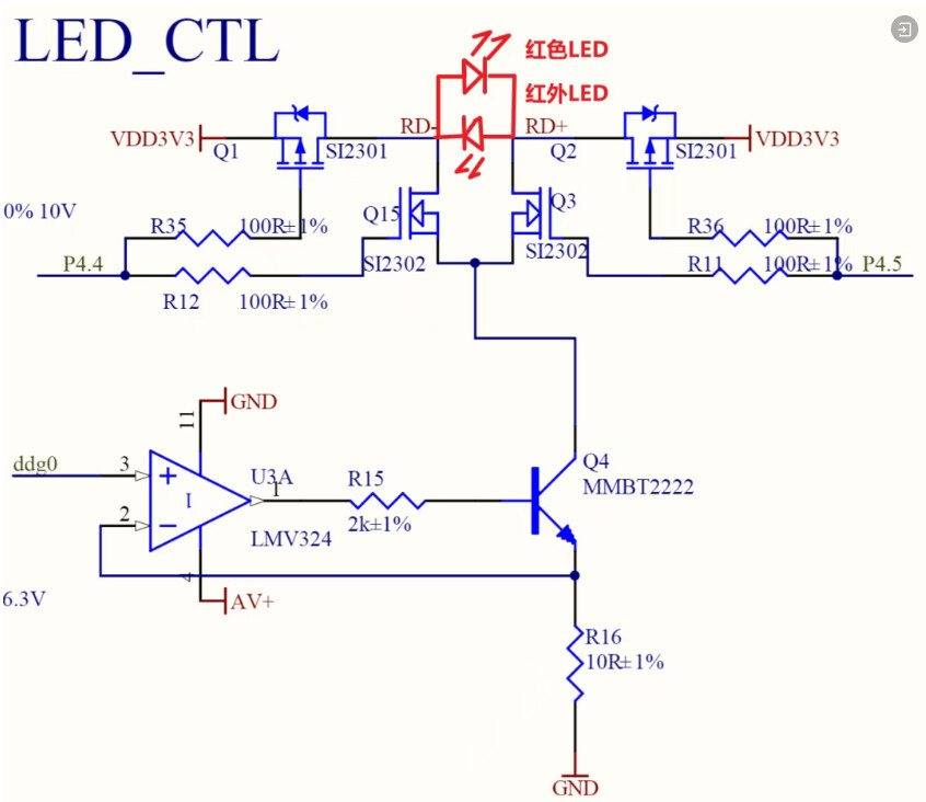 然后是LED灯的控制部分,采用了H桥+SINK类型恒流源的拓扑,RD-和RD+接到外面的LED灯,两个灯首尾相连,这样配合H桥就可以实现交替闪烁,例如Q1和Q3导通的时候红色LED亮,Q2和Q4导通的时候红外LED亮。再配合下面sink类型的恒流源就可以实现两颗灯的恒流控制。