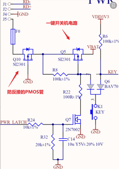 首先就是一键开关机电路,这个电路之前分析过,在网上也有很多博主的讲解,是一个实打实的老电路,不过也不得不说这个电路要想用好也得仔细选物料,不然也够喝一壶的。另外Q10的PMOS管最好在g和s极之间并联一个TVS之类的,毕竟电池端口这边换电池有可能静电损毁。MOS管的GS还是很脆弱的。