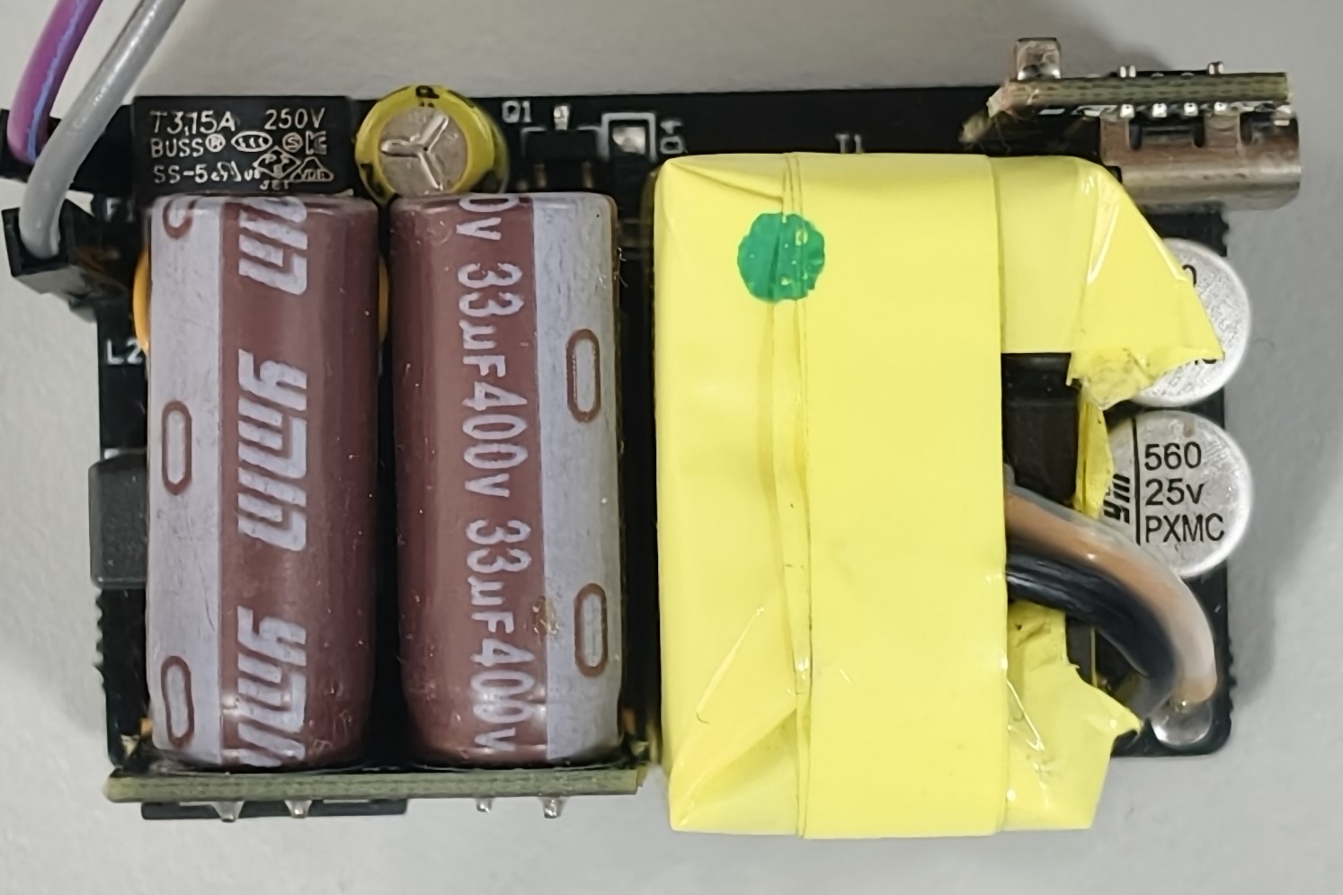 功率因数整体偏低,大部分测试点的功率因数在0.49至0.51之间徘徊,空载时仅为0.036。观察 PCB可发现该电源模块未集成PFC功能,但对于小功率用途(手机充电器等)无伤大雅