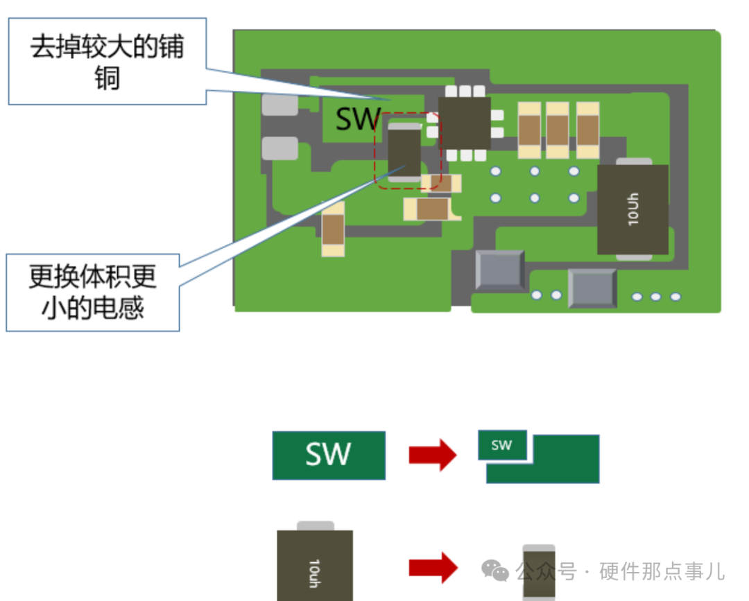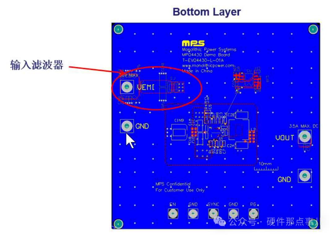SW节点到电感的走线越短越好。寄生电感Ls每多1nH,尖峰电压ΔV = Ls × di/dt(比如di/dt是5A/ns,那ΔV=5V!)。MPS的电源模块把电感直接封在芯片里面,SW走线几乎为零。所以这个就牵涉到以前咱们聊过的一个话题,就是SW节点铺铜是越大越好?还是越小越好呢?相信你现在肯定有答案了,如果没有,狠狠地补课去吧!