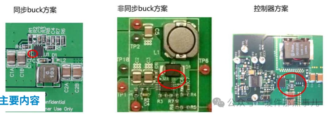 对比三种方案同步Buck芯片,同步方案减少高频电流回路面积,同步buck集成MOSFET,高频电流环路更小,磁场强度更弱,所以EMI效果更好。