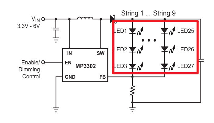 根据你的描述目前看就是电感选型有问题,虽然你选择的电感标注为1.6A,但需要确认这是温升电流还是饱和电流?当背光需求电流较大时,如果电感的Isat低于电路的峰值电流Ipk,电感量会剧烈下降,发生饱和。电感失去储能能力,纹波电流飙升,芯片可能触发内部限流保护,或者导致输出电压Vout无法达到设定值,背光灯条得到的实际电流变小,屏幕发暗。可以用示波器观察MP3302的SW引脚,如果波形出现严重的抖动或占空比异常,说明电感已经饱和。