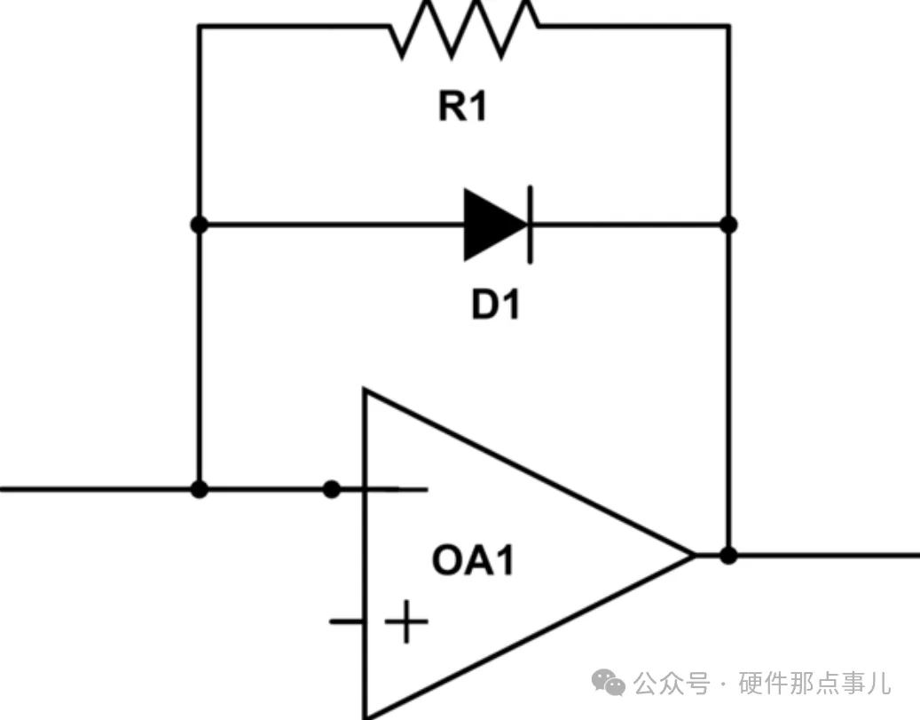 在模拟电路设计中,我们经常会看到一个看似多余的设计:在运算放大器的反馈电阻R1两端,并联了一个二极管D1,如下图所示。