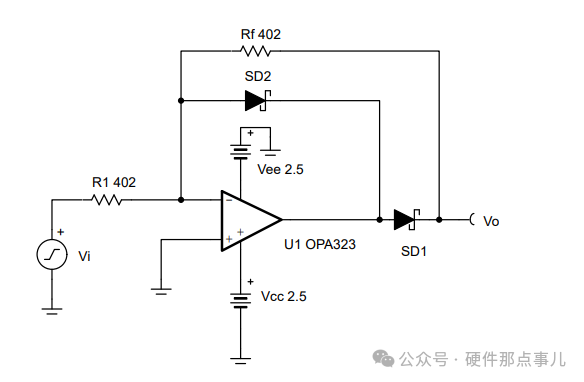 当Vin为正导致Vout变负,且幅度超过二极管压降。二极管导通,将反馈回路短路。结果是运放输出电压会被钳位在二极管的导通压降,约为-0.7V。