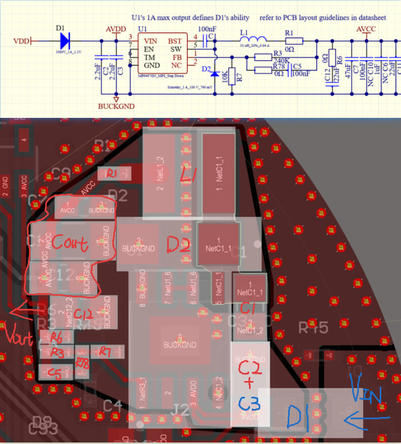 同物料下,不同的布局理论上对于环路的影响不大,但是还是会有些影响。1.看你的layout电感到输出电容的线比较细,可能会引入一些寄生电感,推荐加粗走线。2. 采样点推荐在输出电容点,你参考的那个采在电感输出端也不太好。 3. R1和R6 是没有必要的