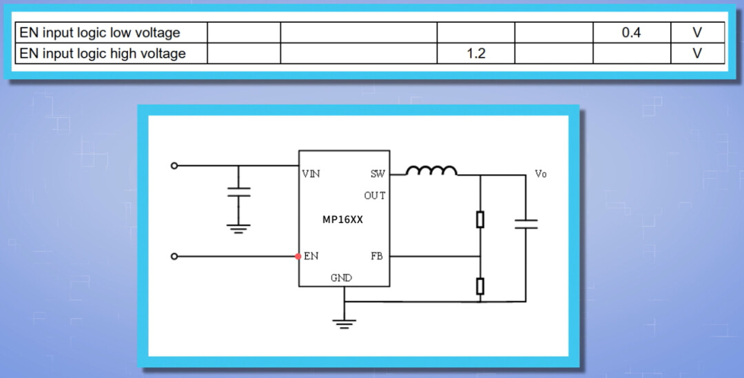 以MP1658 为例,在Vin电压建立后,当EN脚电平高于1.2V,芯片开始工作;当EN脚电平低于1.1V,芯片停止工作。
