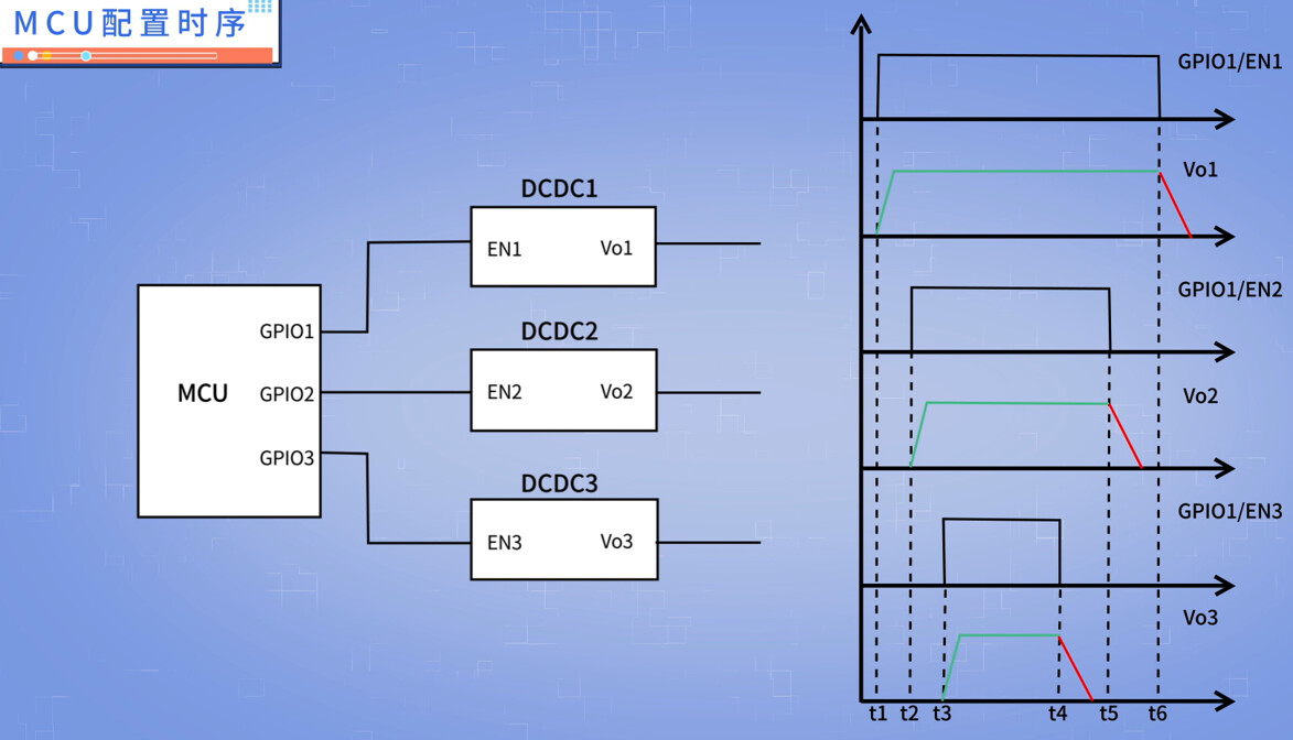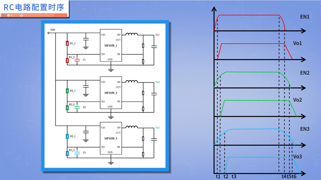 以图示的3颗DCDC系统为例,如果我们在三路电源中采用不同的R和C,配置EN1最先爬升到开通门槛,Vo1开始建立;紧接着,EN2爬升到了开通门槛,Vo2开始建立;最后,EN3爬升到开通门槛,Vo3开始建立。