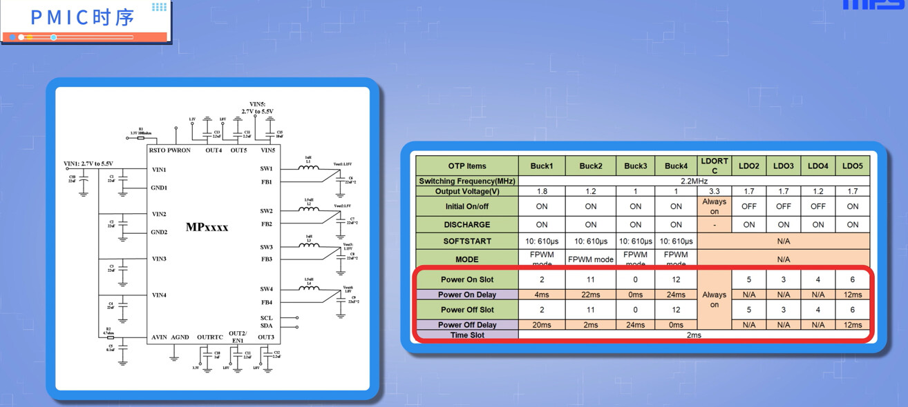 为了得到更完美的开关机时序,随着芯片技术的发展,对许多PMIC芯片而言,只需要简单地配置几个寄存器,就能得到需要的开关机时序和各路输出的延迟时间。 而且开机和关机时序可以完全解耦,关机时序不再会受到开机时序的限制。同时,开关机时序以及延迟时间受器件分散性影响非常小,几乎可以忽略不计。