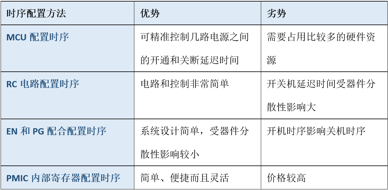 最后,我们来做一个回顾总结:在电源需求比较复杂的系统中,需要配置不同电源输出之间的开关机时序,通常我们有下列四种方法。