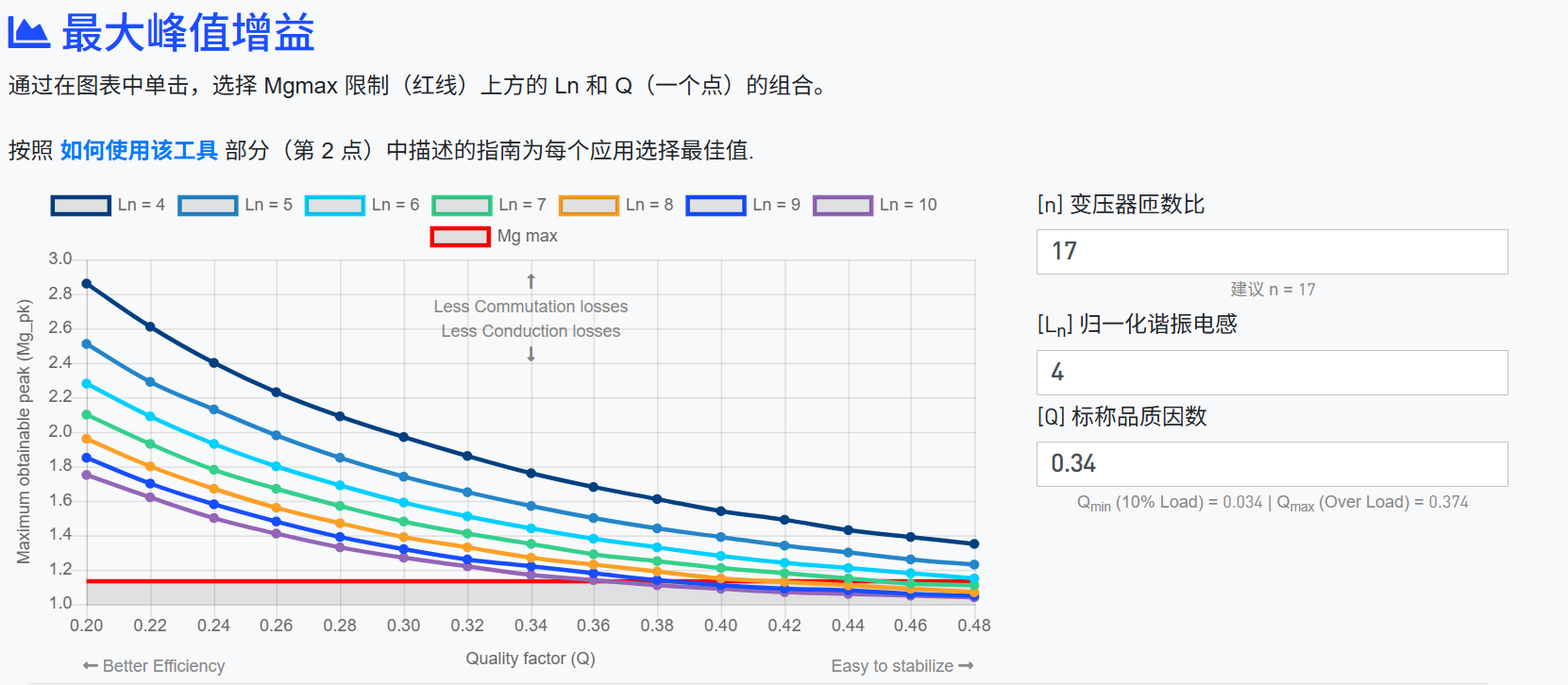 然后进入一个叫“最大峰值增益”的图表,里面有好几条曲线,每条对应一个Ln(Lm/Lr)。横坐标是Q,纵坐标是峰值增益。红线是刚才的Mgmax=1.13。
