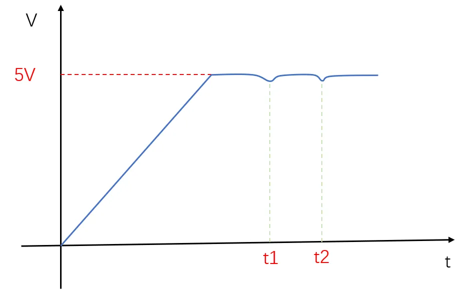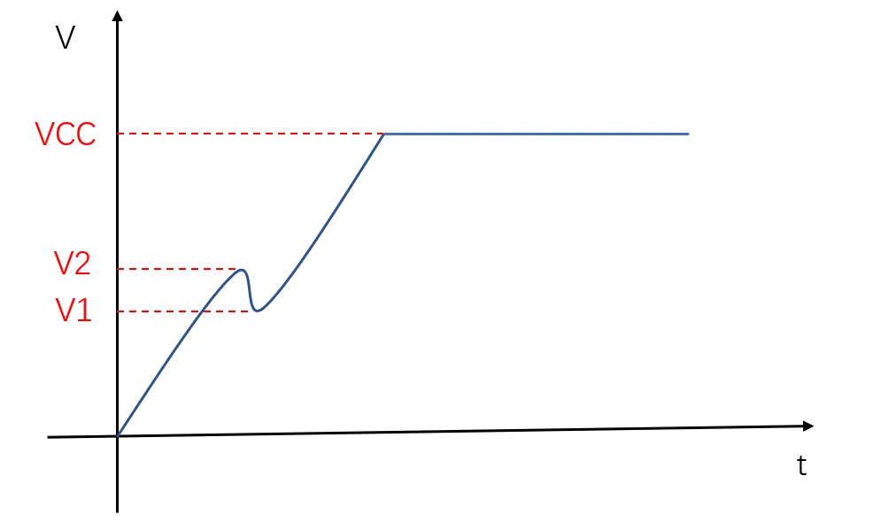 电源上电回勾是指电源电压输出在从0V上升到目标电压过程中出现突降后再继续上升的现象,如下示意图,电压已经上升到V2之后瞬间又回到V1开始上升。