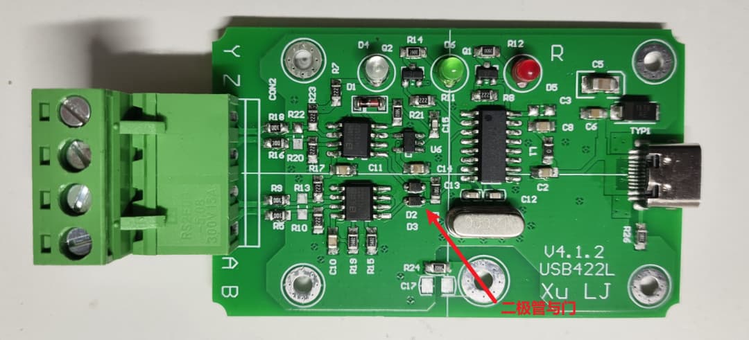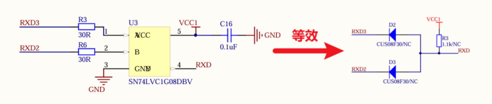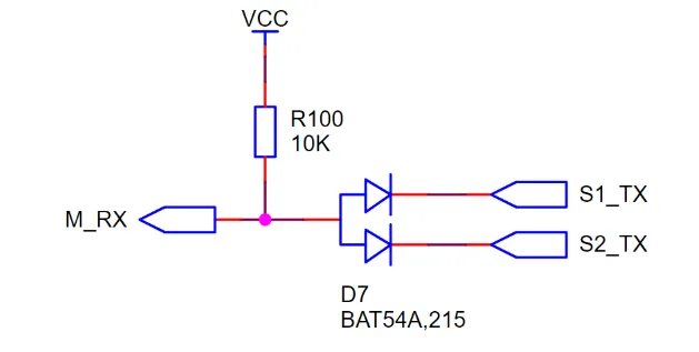 又因为串口空闲为高电平,低电平为数据/起始位,所以从机发送只需要通过使用二极管搭建与门,将两个从机的TX进行与逻辑运算。这样从机1发送的时候,由于从机2处于发送空闲状态(输出1),那么从机2不会干涉从机1的发送信息。