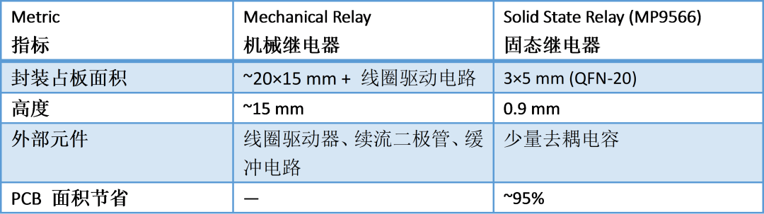 一个典型的 5A/24VAC 机械继电器尺寸约为 20×15×15 毫米,并需要额外的线圈驱动电路,占用大量 PCB 面积,限制了产品的小型化。