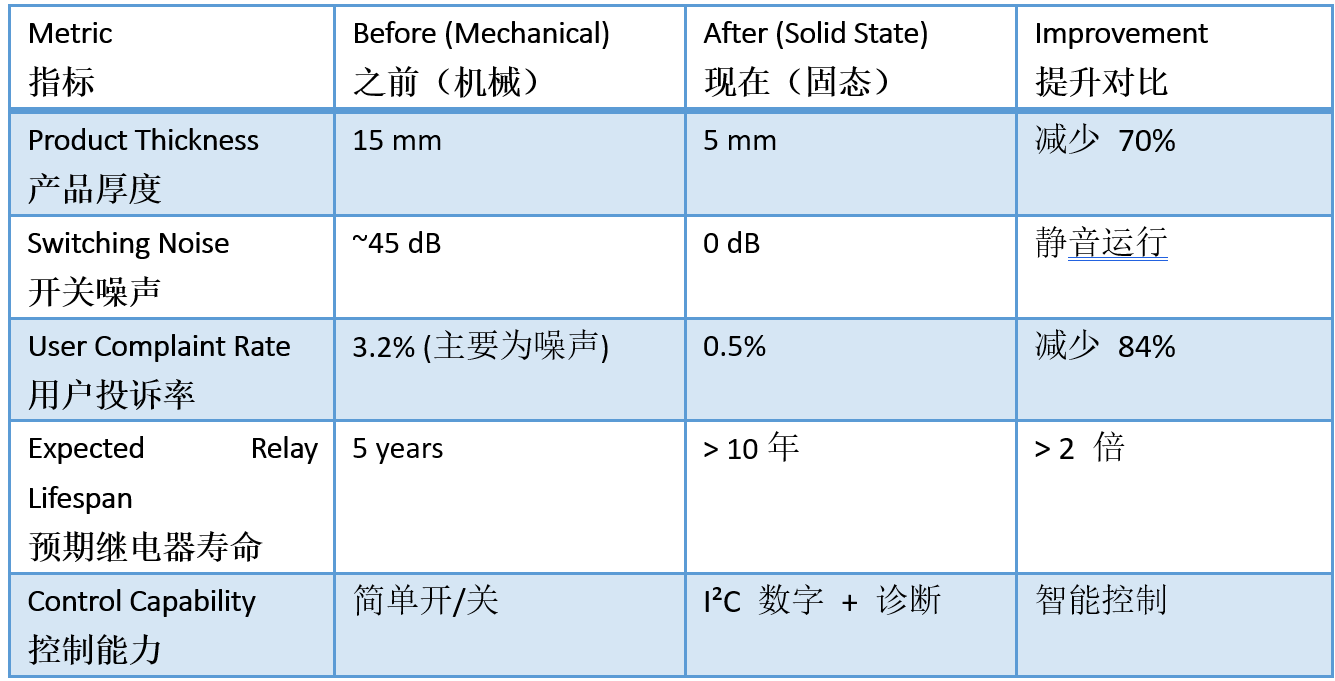 一家智能家居 OEM 厂商在其温控器产品线中将机械继电器替换为基于 MP9566 的设计。以下是转型前后测量的指标: